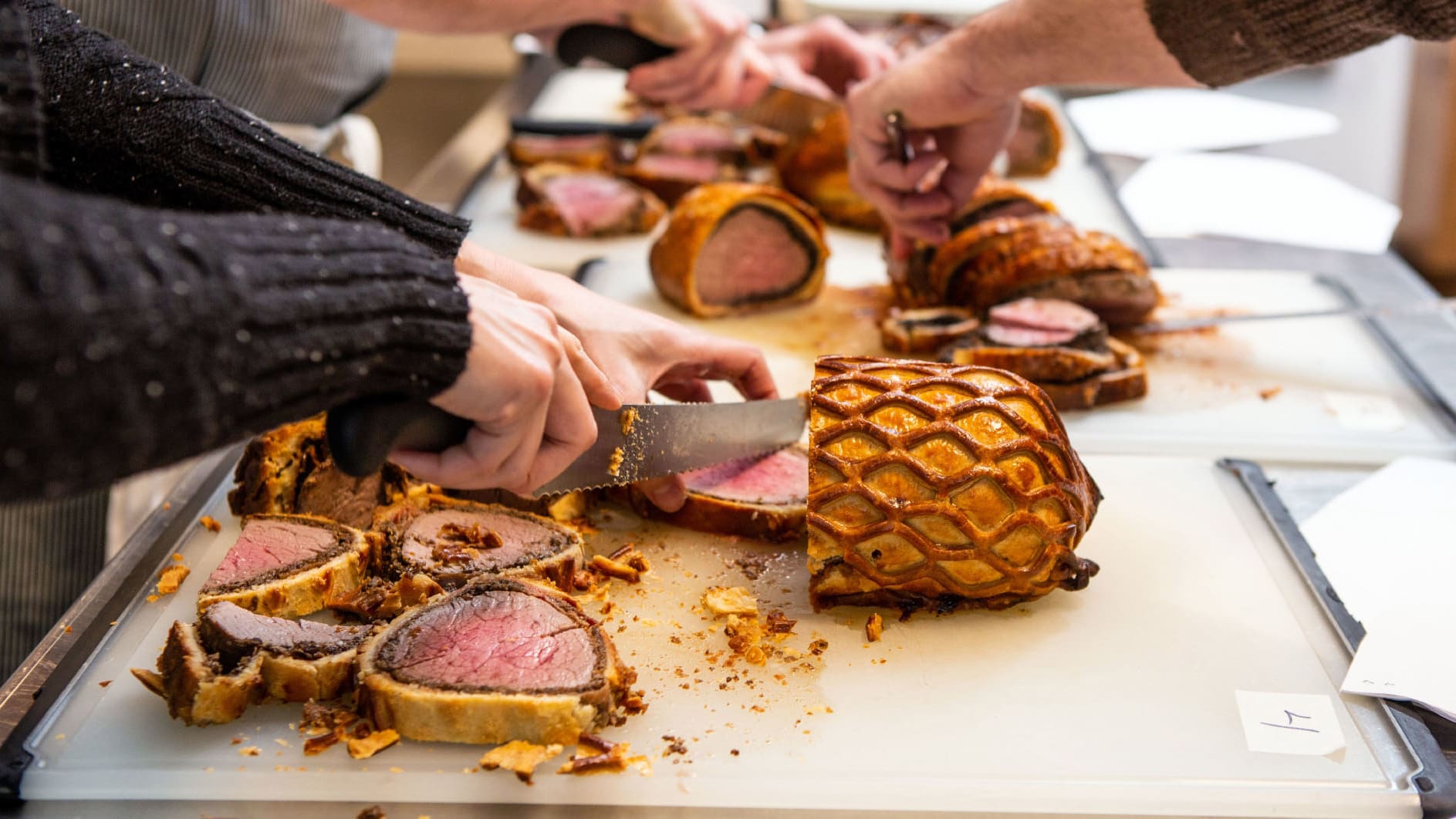Members of the Cook's Illustrated team slice and sample rosy medium-rare beef Wellingtons to pick a favorite.