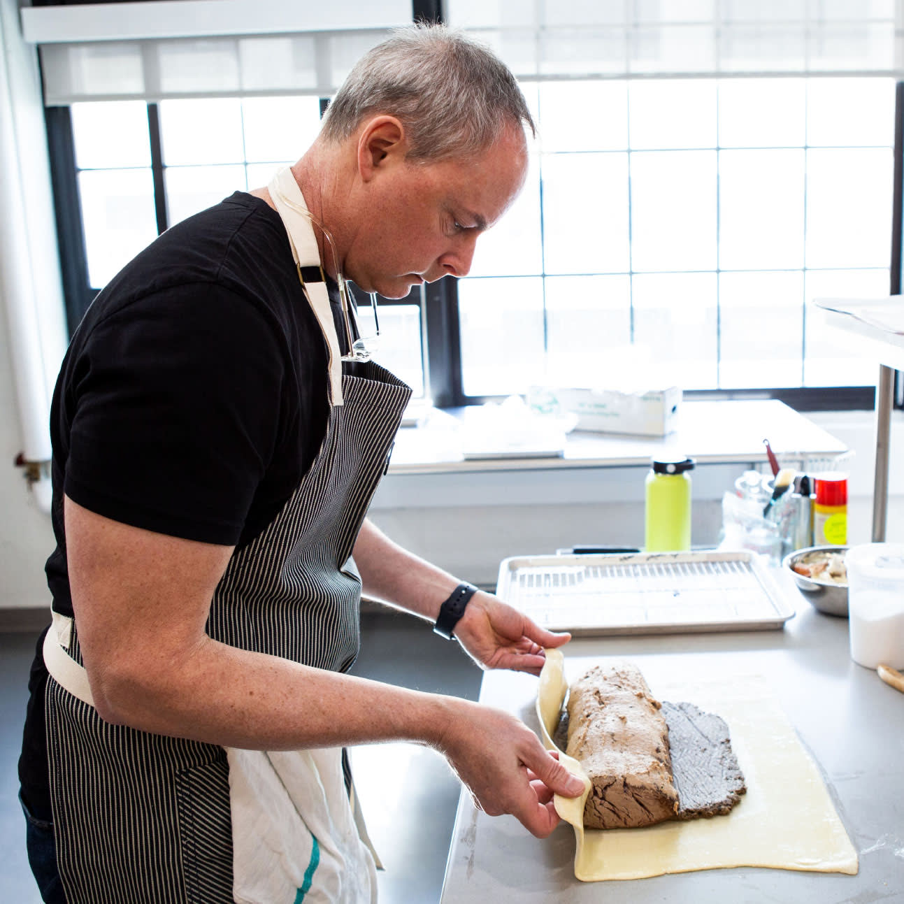 Next, the pastry. Most modern recipes call for store-bought puff pastry, but the frozen dough often emerged from its package cracked where it had been folded and, as it warmed, was easy to tear. Once cooked, it slumped in spots and never fully crisped. However, one recipe from the innovators at ChefSteps promised success with pâte brisée, an all‑butter dough often used for tarts. Sure enough, this dough was easy to work with, even as I decorated the top of the Wellington with slender dough strips arranged on an elegant diagonal. Unlike the doughs of many other recipes I tried, which crumbled when sliced, this buttery, flaky crust was just sturdy enough to pass the slicing test.